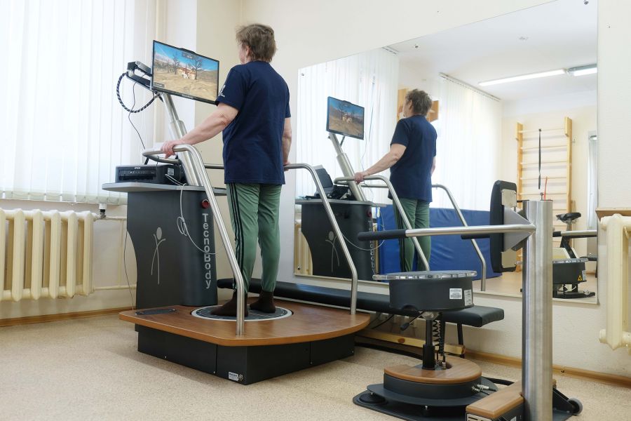 Специалисты начинают реабилитацию в раннем послеоперационном периоде. Для комплексного возвращения двигательных функций применяют линейку новой медицинской техники. В нее входят тренажер для восстановления навыков вертикального стояния и координации, стабилоплатформа с постуральным контролем, позволяющая оценить способность центральной нервной системы удерживать равновесие и правильное положение тела в пространстве, интерактивная беговая дорожка, велоэргометр с электромагнитной системой нагрузки, оснащенный датчиками для контроля пульса, автоматической регулировкой сопротивления и другими полезными функциями.