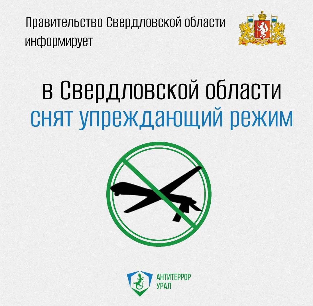 В Свердловской области снят введенный днем 15 апреля упреждающий режим реагирования на возможную атаку БПЛА, сообщили в Департаменте информационной политики региона.