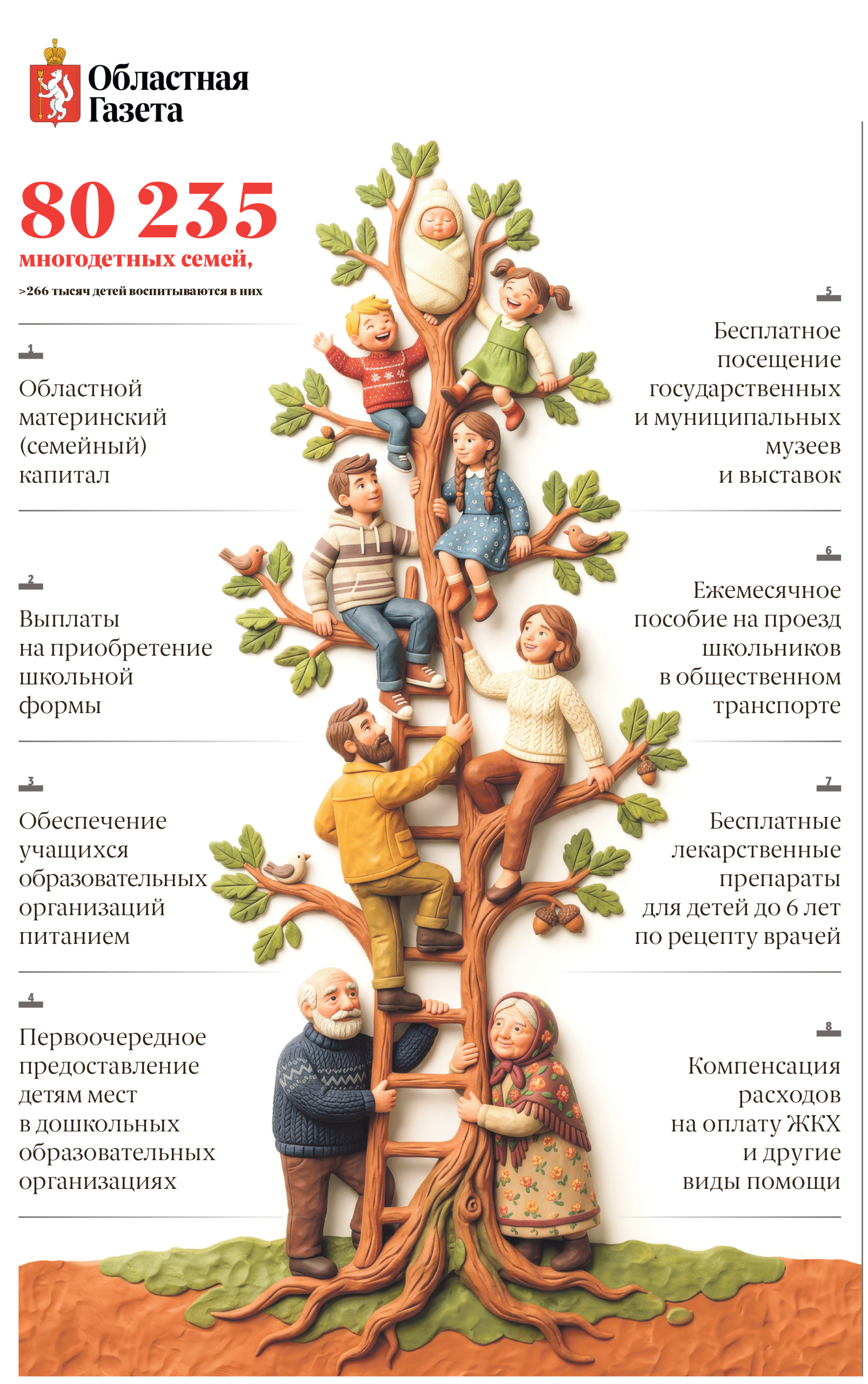В Свердловской области проживают более 80 тыс. многодетных семей, в которых воспитываются 266 тыс. детей. Какие меры их поддержки действуют в регионе – рассказываем в нашей инфографике.